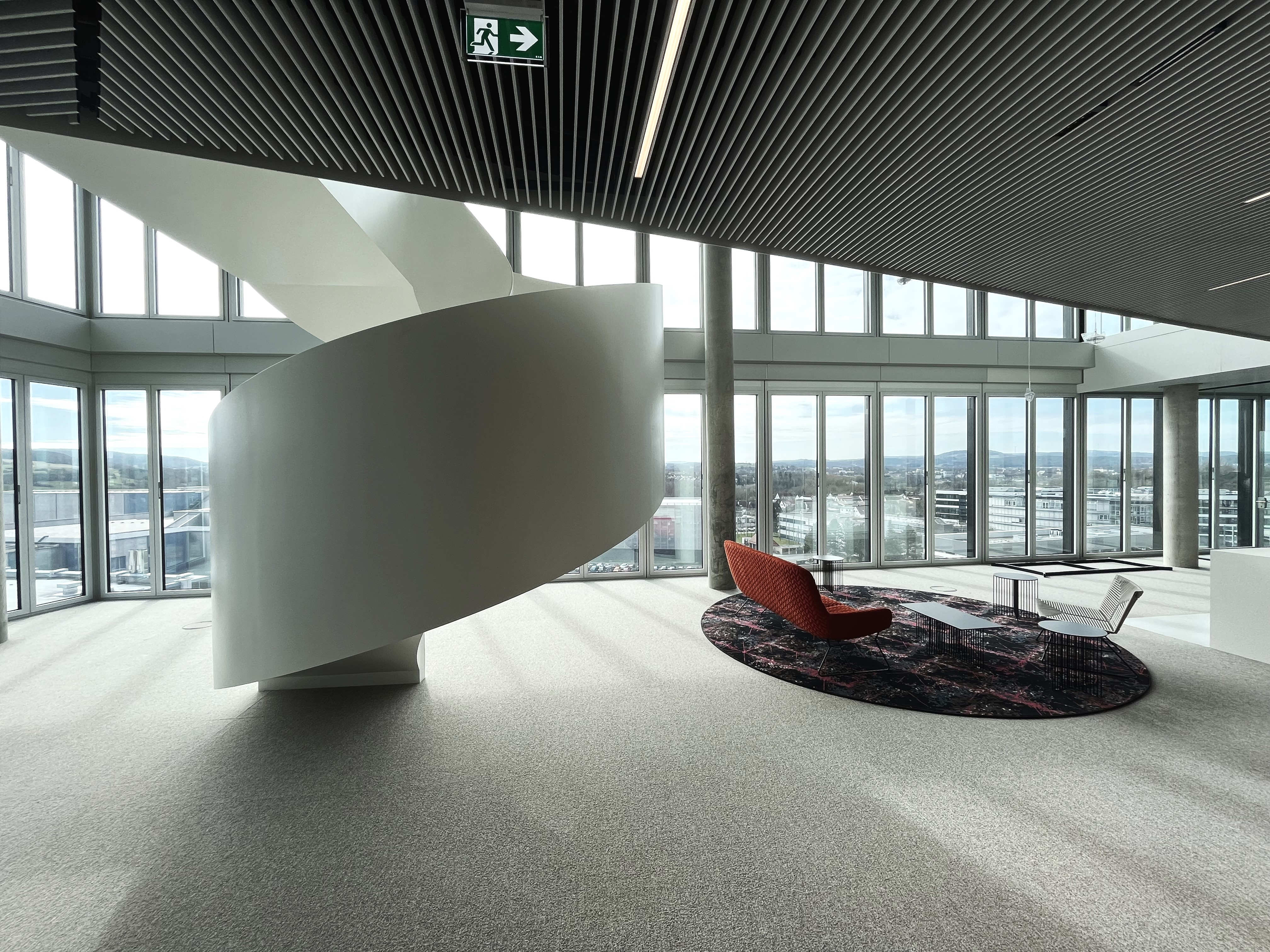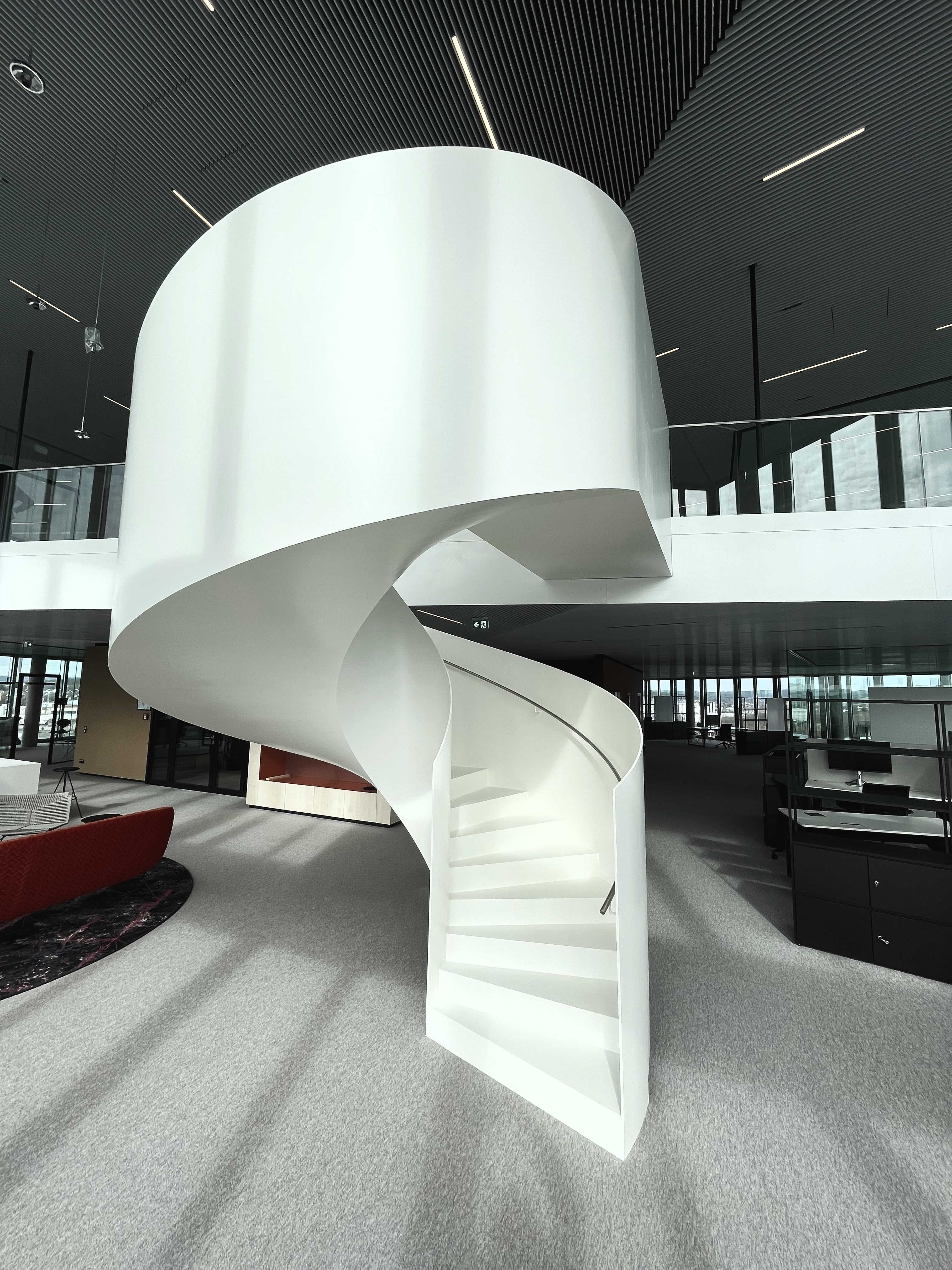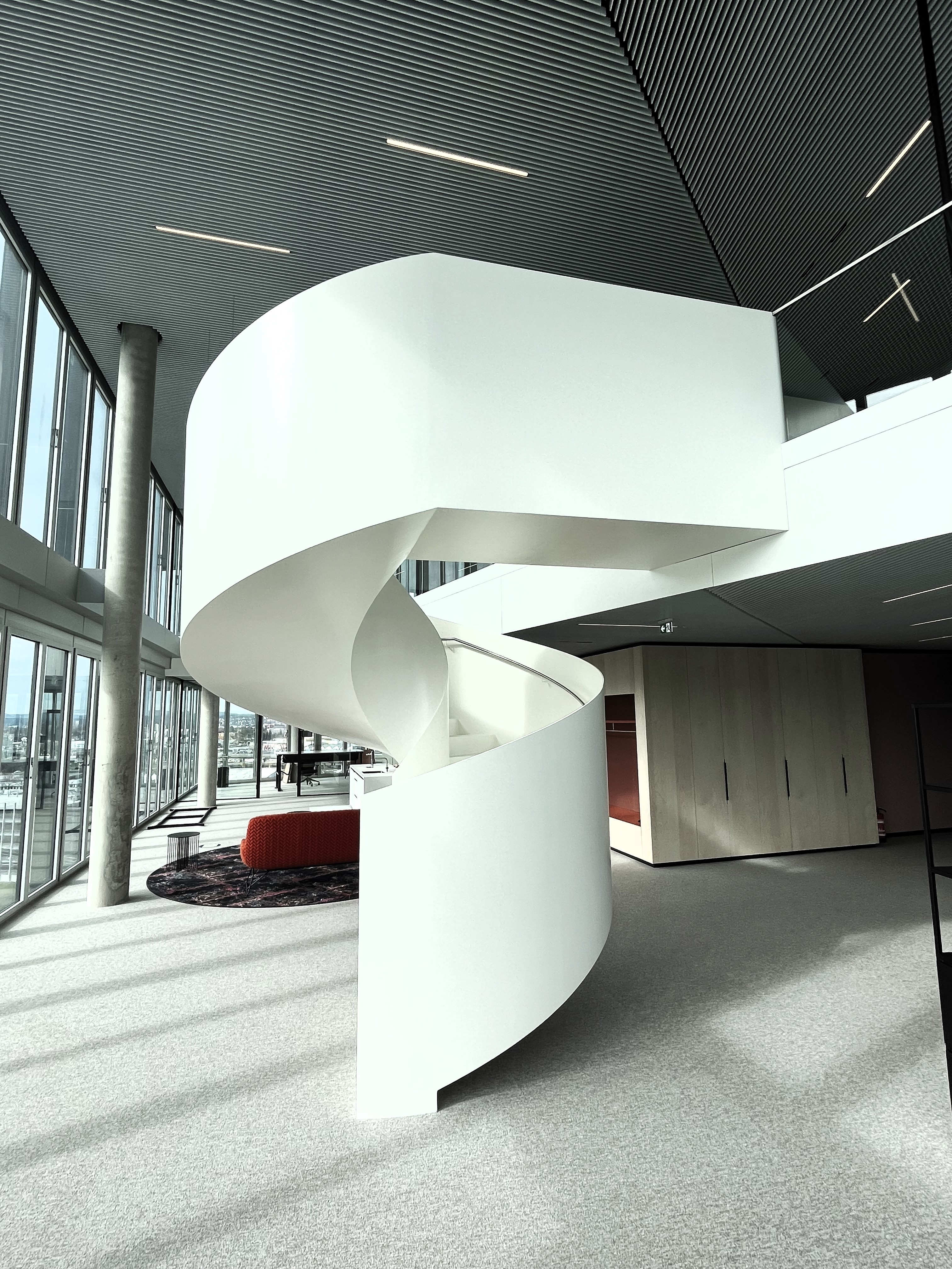 Die Treppe dient als Gestaltungselement und Kunstobjekt innerhalb einer Büroetage und ist baurechtlich nicht notwendig. Durch die offene Alu-Glas-Fassade ist die Treppe weithin sichtbar.